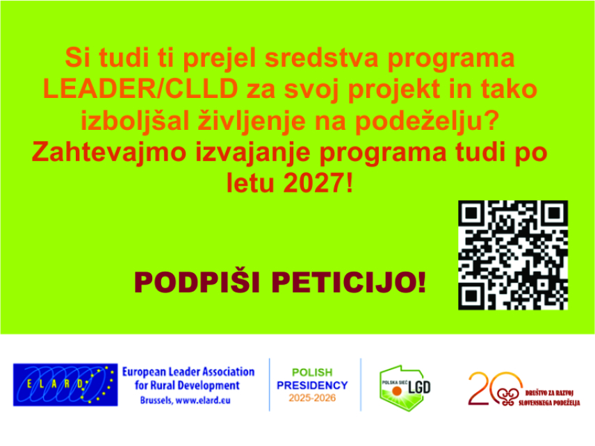 Evropska LEADER mreža za razvoj podeželja - ELARD, s podporo nacionalnih mrež kot je Društvo za razvoj slovenskega podeželja, je objavil peticijo s katero poziva k poštenemu dogovoru za podeželsko Evropo. Zahtevajmo trdnejšo prihodnost za podeželsko Evropo in zagotavljanje LEADER/CLLD kot stebra razvoja EU.
